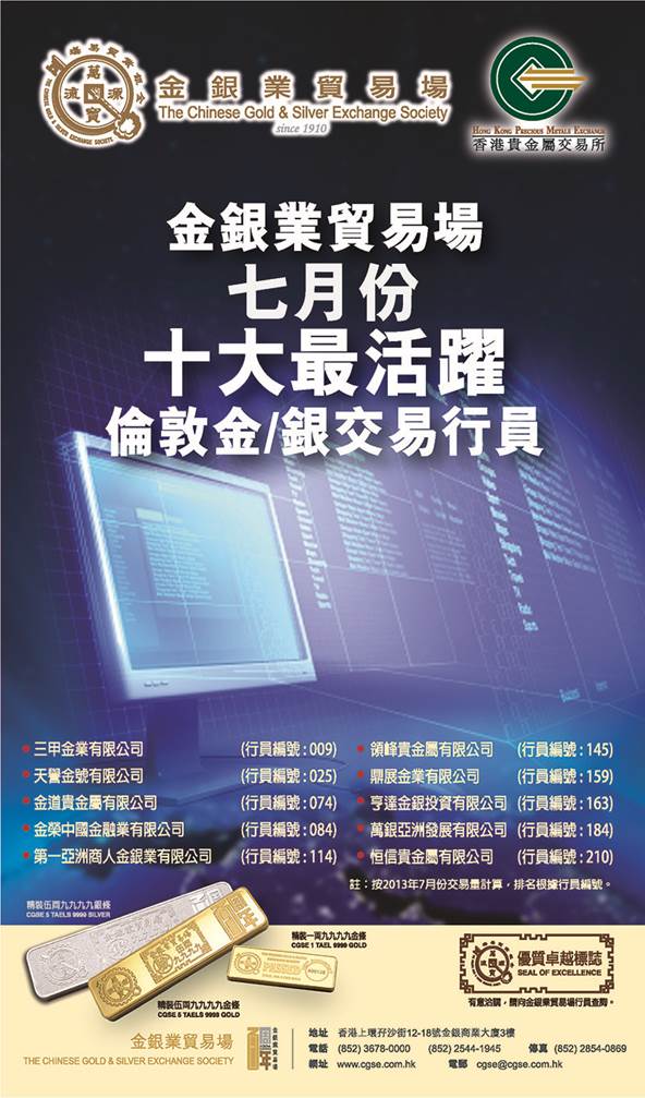 We are pleased to let you know that KAB Bullion Company Limited continued to achieve encouraging recognition from the peers and the public in the third quarter of 2013. KAB Bullion Company Limited awarded the top 10 most active trading members in July from the Chinese Gold and Silver Exchange Society (CGSE), which is the fourth consecutive month that the company won the award.
