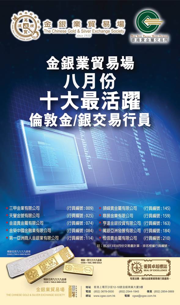 We are pleased to let you know that KAB Bullion Company Limited continued to achieve encouraging recognition from the peers and the public in the third quarter of 2013. KAB Bullion Company Limited awarded the top 10 most active trading members in August from the Chinese Gold and Silver Exchange Society (CGSE), which is the fifth consecutive month that the company won the award.
