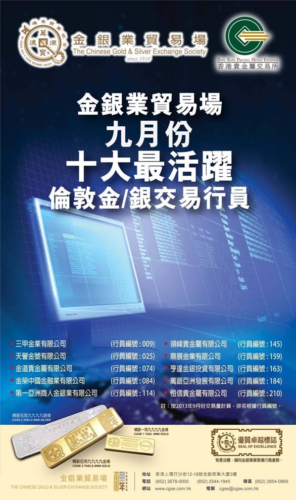 We continue to deliver solid business result. We are pleased to let you know KAB Bullion Company Limited continued to achieve encouraging recognition from the peers and the public in Sep 2013. KAB Bullion Company Limited awarded the top 10 most active trading members from April to September in the Chinese Gold and Silver Exchange Society (CGSE).
